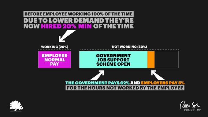 “Example: a typical full-time employee in the hospitality industry is paid an average of £1,100 per month. Under the Jobs Support Scheme for open businesses, they will still take home at least £807 a month. All the employer needs to pay is a total of £283 a month or just £70 a week; the government will pay the rest.”
