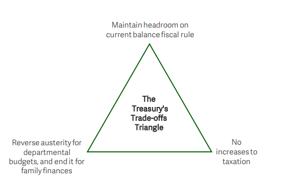 On the face of it Rishi Sunak can only pursue two of these options, which  The Resolution Foundation have helpfully identified as ‘the treasury trade-off triangle’ (they should also be commended for the alliteration).