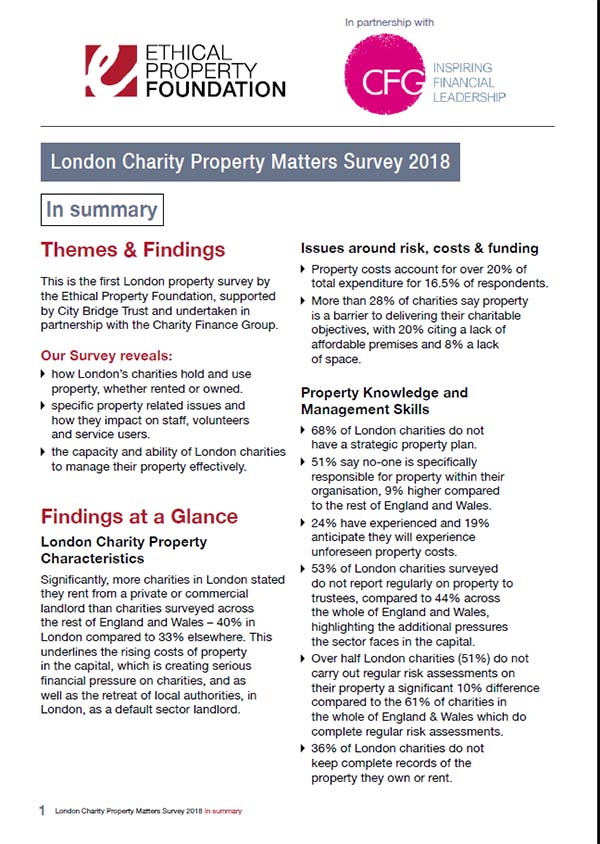 The Survey reveals: how London’s charities hold and use property, whether rented or owned specific property related issues and how they impact on staff, volunteers and service users the capacity and ability of charities to manage their property effectively.