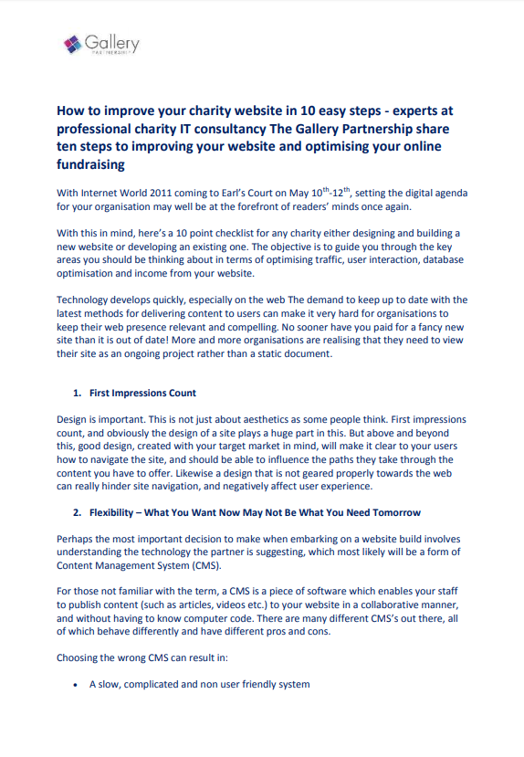 How to improve your charity website in 10 easy steps - experts at professional charity IT consultancy The Gallery Partnership share ten steps to improving your website and optimising your online fundraising.