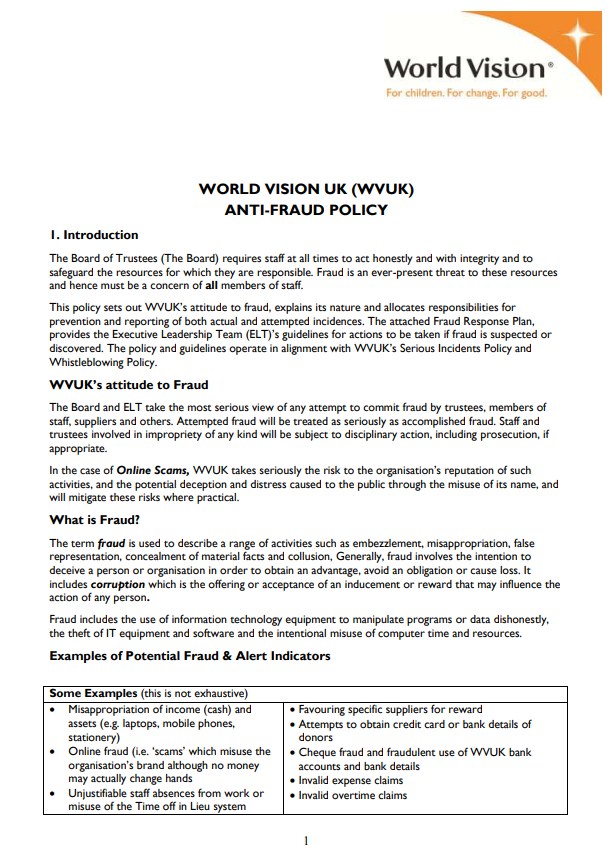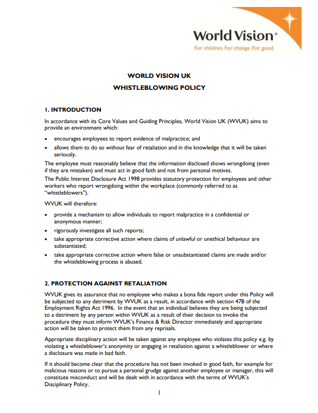 World Vision UK's policy on Whistleblowing