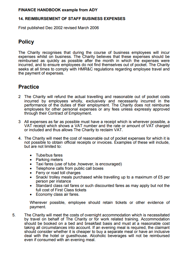 Describes the policy and procedure for charities when handling expenses. Also outlines practical and procedural steps in implementing effective expenses systems.