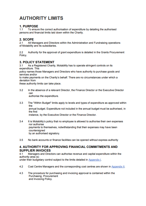 This policy names the Directors and Managers who have the authority to purchase goods and services and/or to make payments on the charity’s behalf.