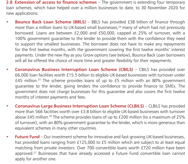 Many of the additional measures provided offer extensions to the application period for the four government-backed loans schemes and changes to the repayment for bounce-back loans (labelled as ‘Pay as you Grow’) meaning it can now be paid over 10 years, with the option to make interest only payments, or for those in real difficulty suspend payments. Lenders under CBILS can also extend the term of the loans for up to ten years. Further details on the extension of the four loans schemes can be found below: