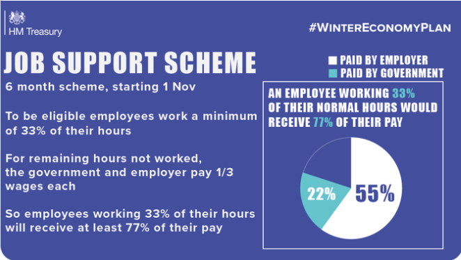The centrepiece of the Chancellor’s approach was the ‘Job support scheme’ which will begin on 1 November, as the Job Retention Scheme comes to an end, and will last for six months. The scheme will provide a top-up on wages for employees working a minimum of 33% of their hours.