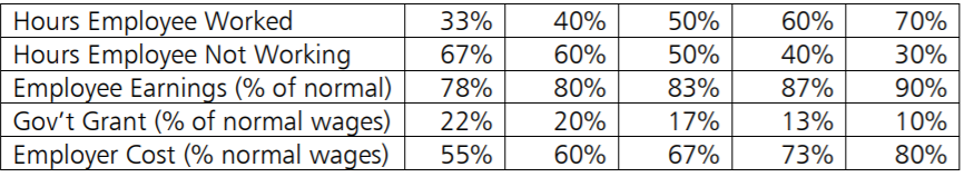 The government has also provided a helpful Job Support Scheme factsheet which includes a table outlining the various costs to employers or government depending on how many hours worked: